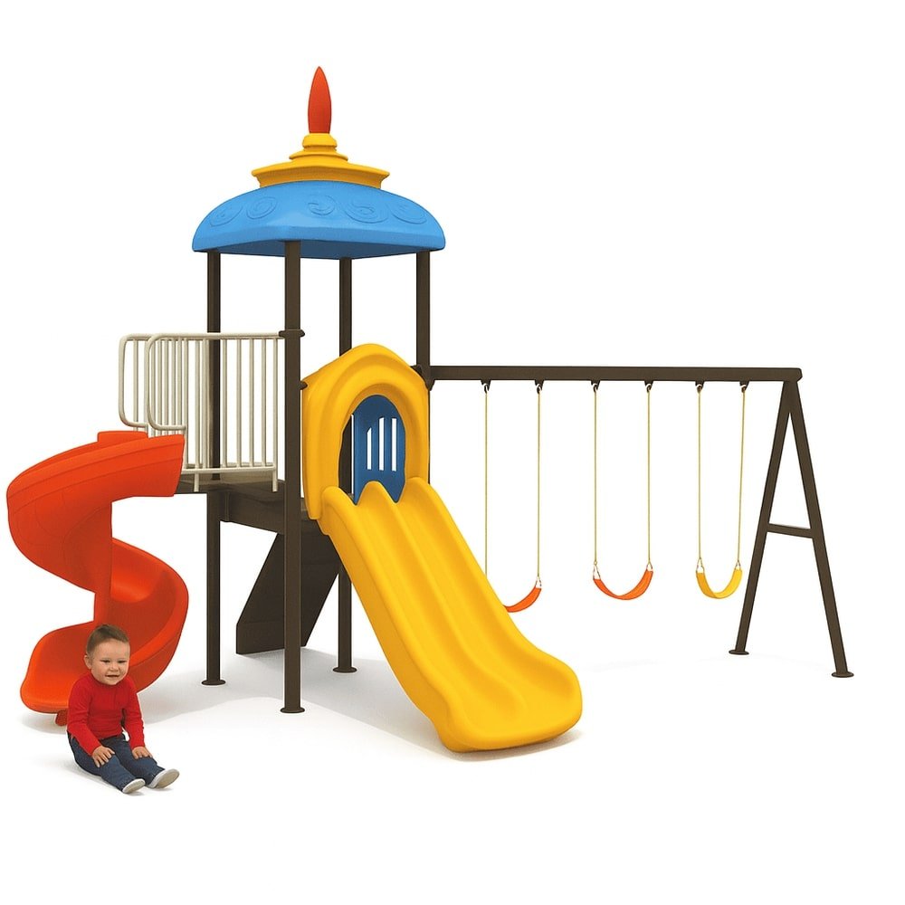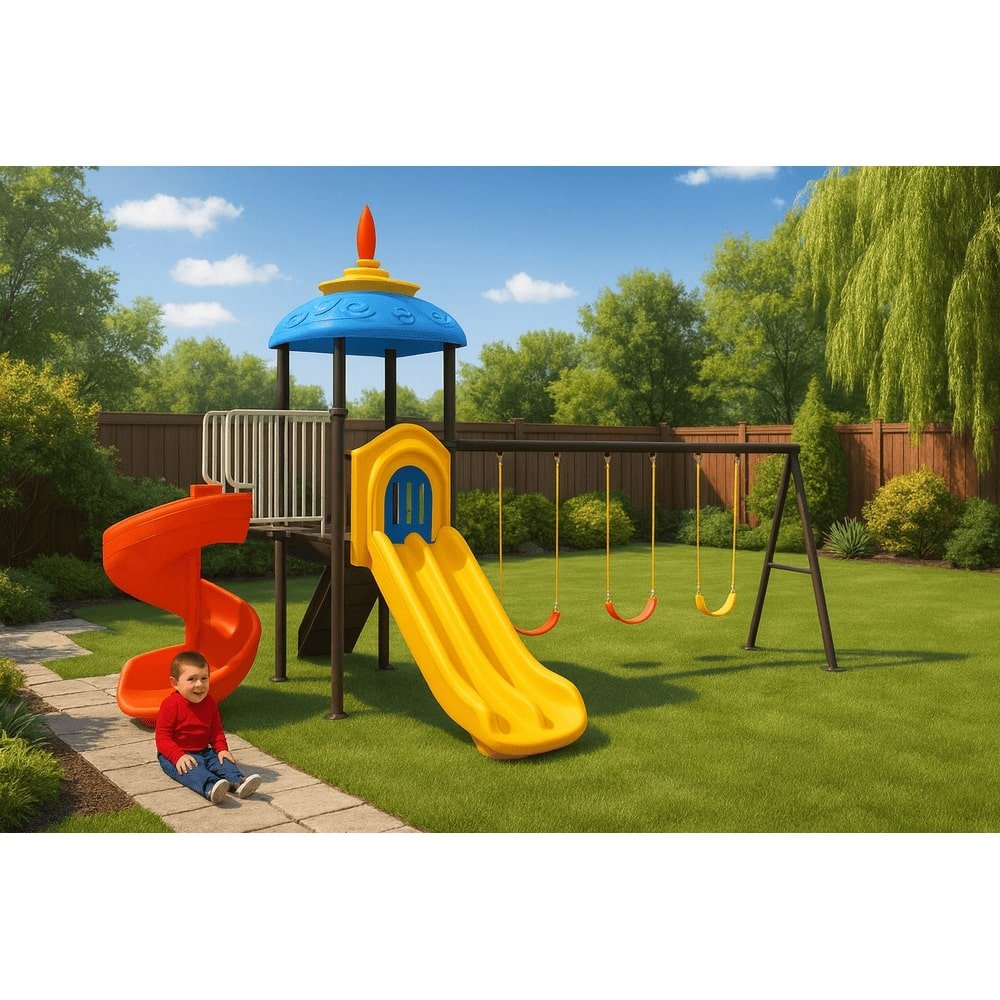This deluxe MYTS playground set is designed for kids to enjoy endless hours of safe play. With dimensions of 620*460*405 cm, it provides spacious activity zones including climbing, sliding, and imaginative play. It is designed to inspire imaginative roleplay and creativity, while also being bright, attractive design that keeps children engaged. This playset is crafted with child safety as the top priority and a centerpiece for any playground or backyard. Children will benefit as it perfect for schools, nurseries, or spacious gardens, and parents love that it is engineered for long-lasting outdoor fun. Please note There can be slight change of color or design from what is shown in picture . A wonderful choice to create joyful childhood experiences.