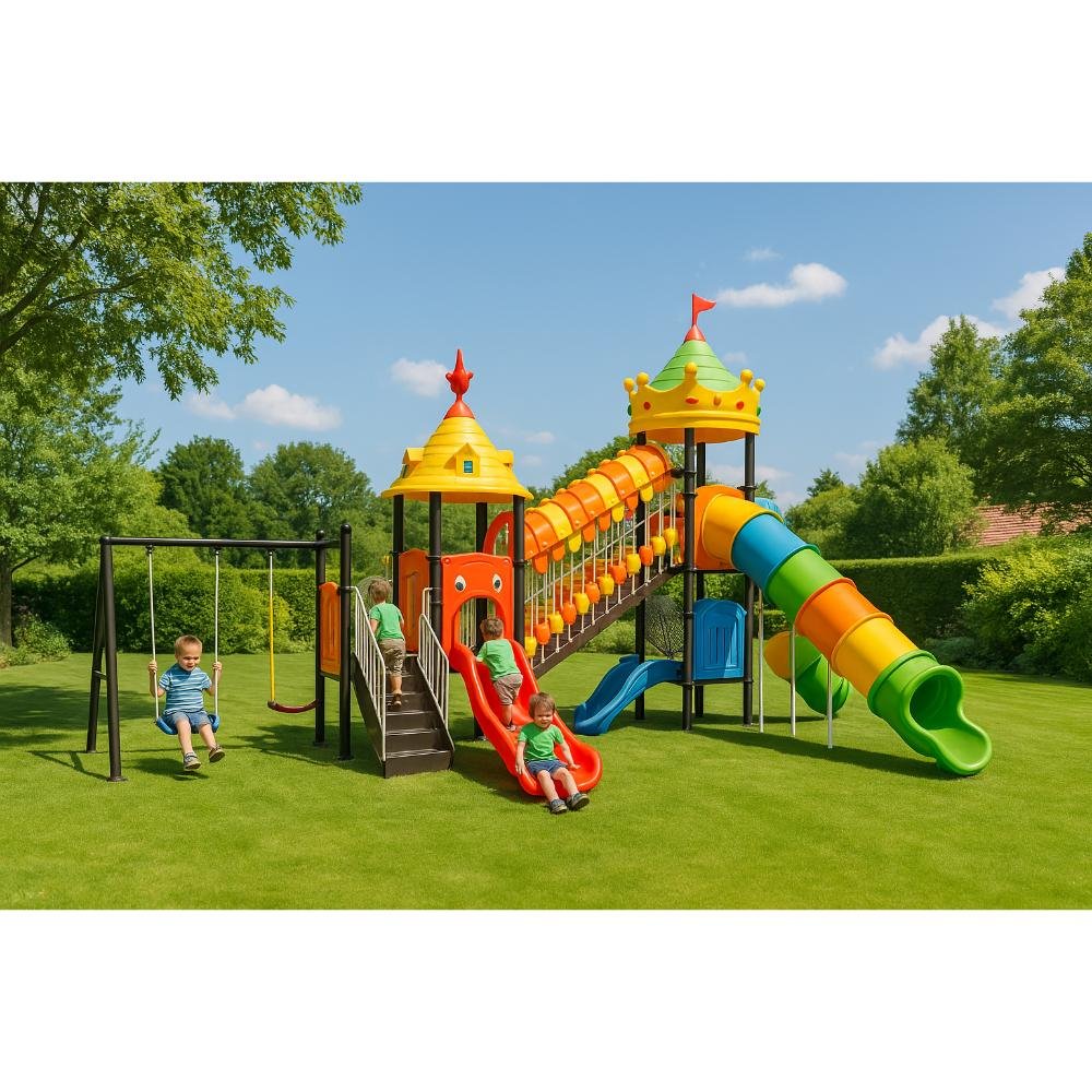 This deluxe MYTS playground set is designed for kids to enjoy endless hours of safe play. With dimensions of 1365*890*545 cm, it provides spacious activity zones including climbing, sliding, and imaginative play. It is engineered for long-lasting outdoor fun, while also being bright, attractive design that keeps children engaged. This playset is built from durable materials that withstand tough weather and helps children develop motor skills while having fun. Children will benefit as it encourages active play, teamwork, and balance, and parents love that it is crafted with child safety as the top priority. Please note There can be slight change of color or design from what is shown in picture. A wonderful choice to create joyful childhood experiences.