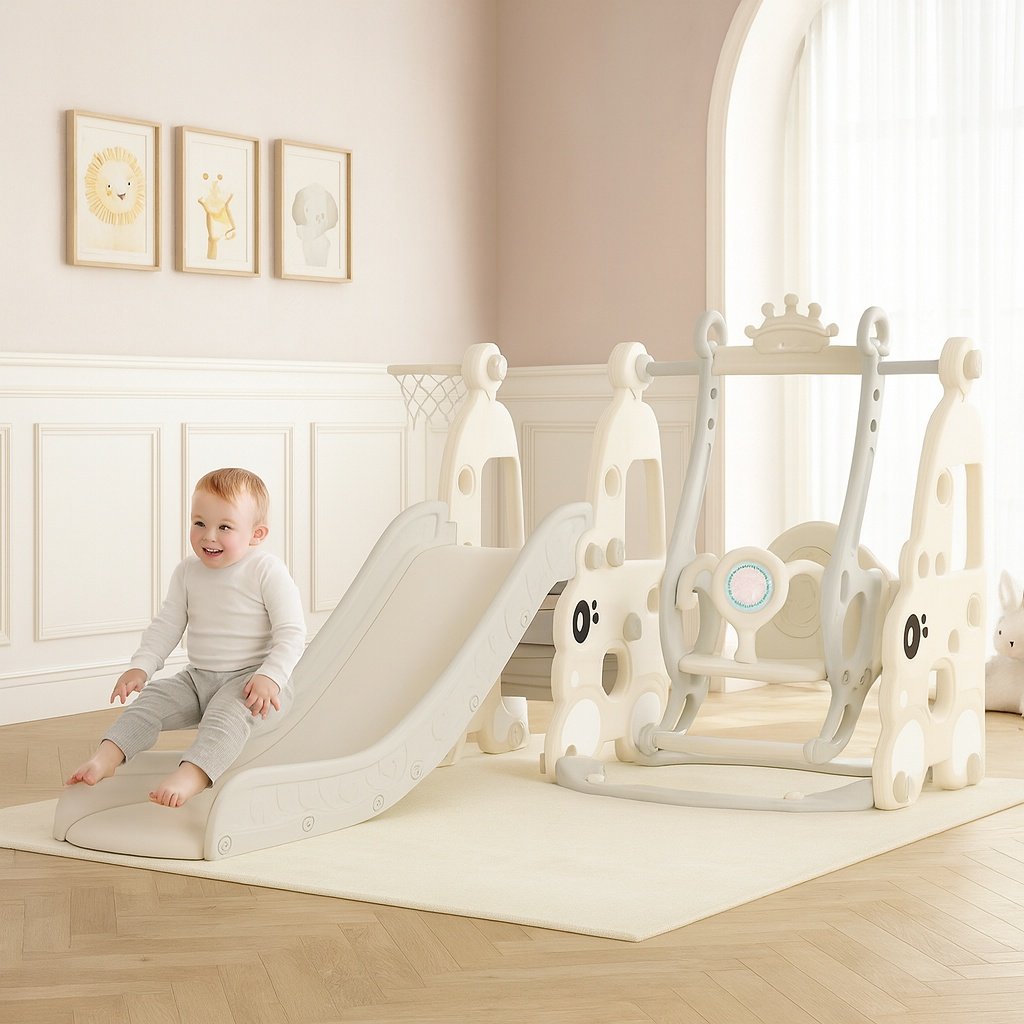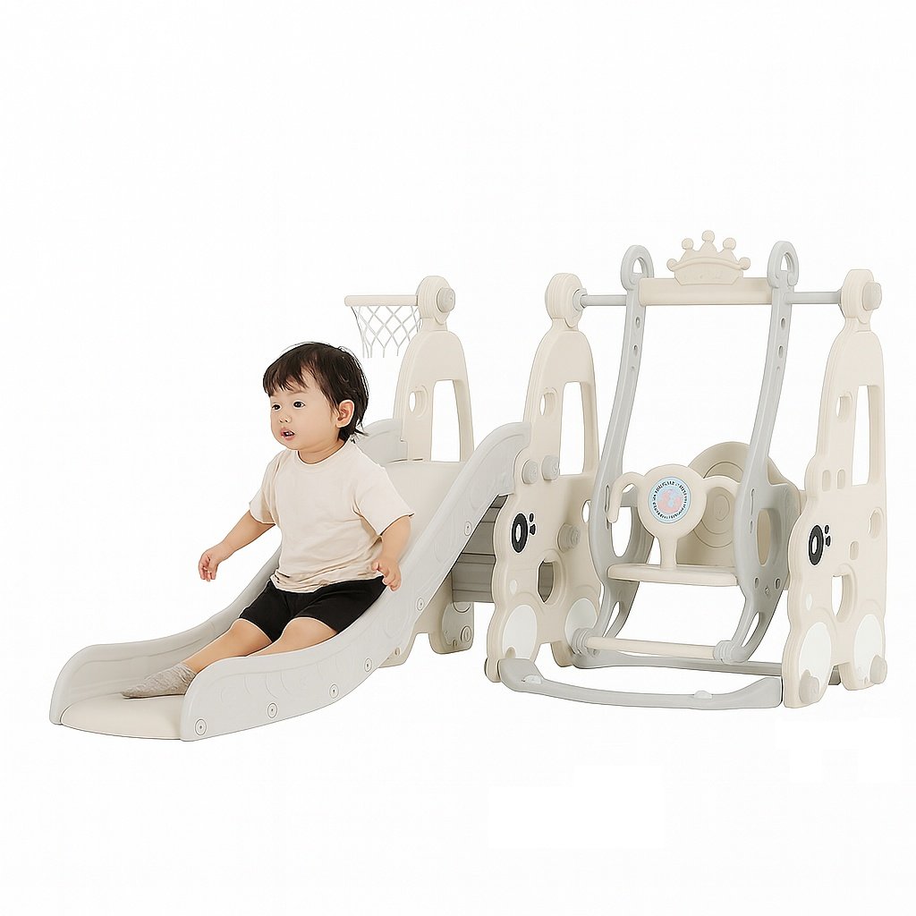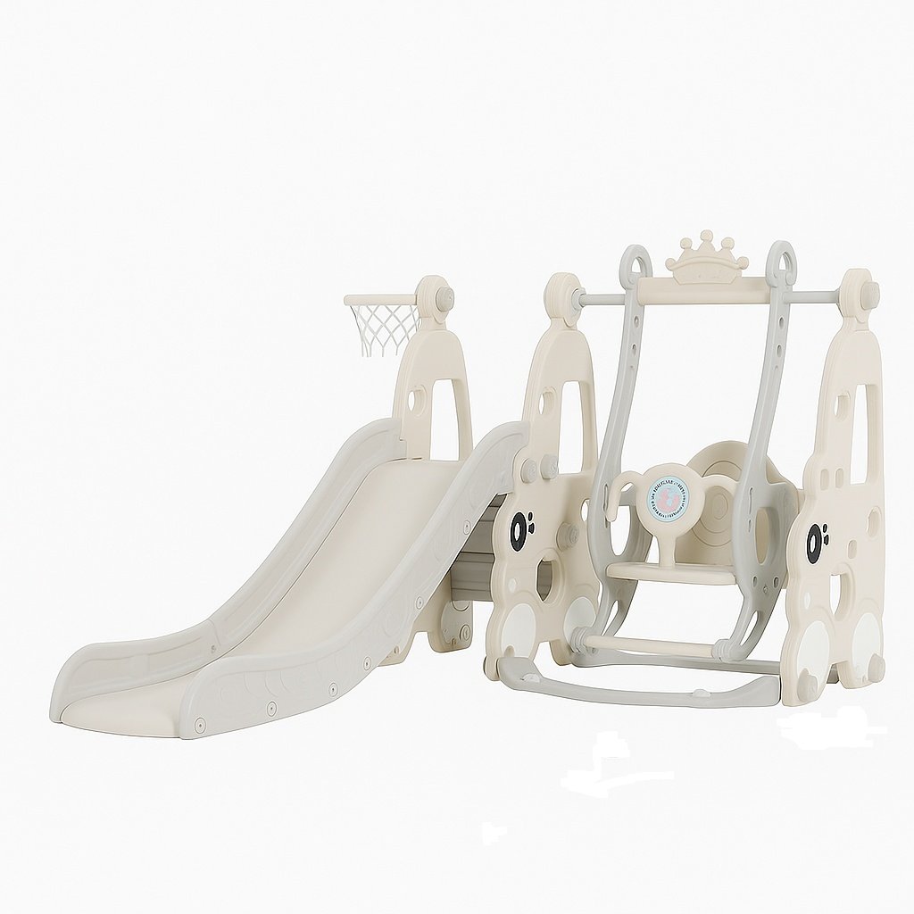 This 4-in-1 Slide, Swing, and Basketball Hoop set is the ultimate playtime companion for your child’s indoor or outdoor playground. Designed to spark imagination and encourage active play, it offers multiple activities in one sturdy and safe structure. Whether your little one wants to slide, swing, shoot hoops, or enjoy stories through the built-in story machine, this set has it all. Crafted with durable, child-friendly plastic and smooth, rounded edges, it ensures a safe and joyful experience every time. The structure is reinforced for extra stability, giving parents peace of mind while kids explore, jump, and play freely.
