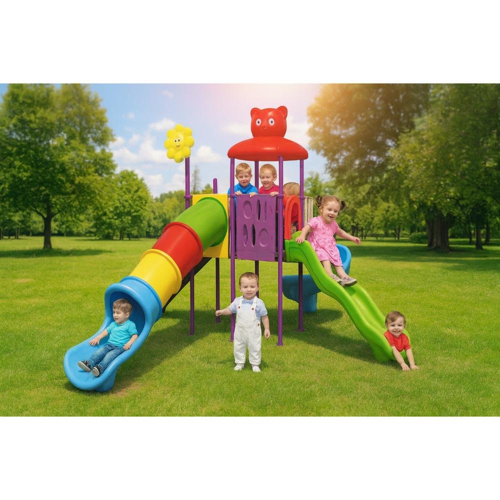 This deluxe MYTS playground set is designed for kids to enjoy endless hours of safe play. With dimensions of 510*535*325 cm, it provides spacious activity zones including climbing, sliding, and imaginative play. It is bright, attractive design that keeps children engaged, while also being a centerpiece for any playground or backyard. This playset is engineered for long-lasting outdoor fun and encourages active play, teamwork, and balance. Children will benefit as it perfect for schools, nurseries, or spacious gardens, and parents love that it is parents can relax knowing it is built with safety standards. Please note There can be slight change of color or design from what is shown in picture .A wonderful choice to create joyful childhood experiences.