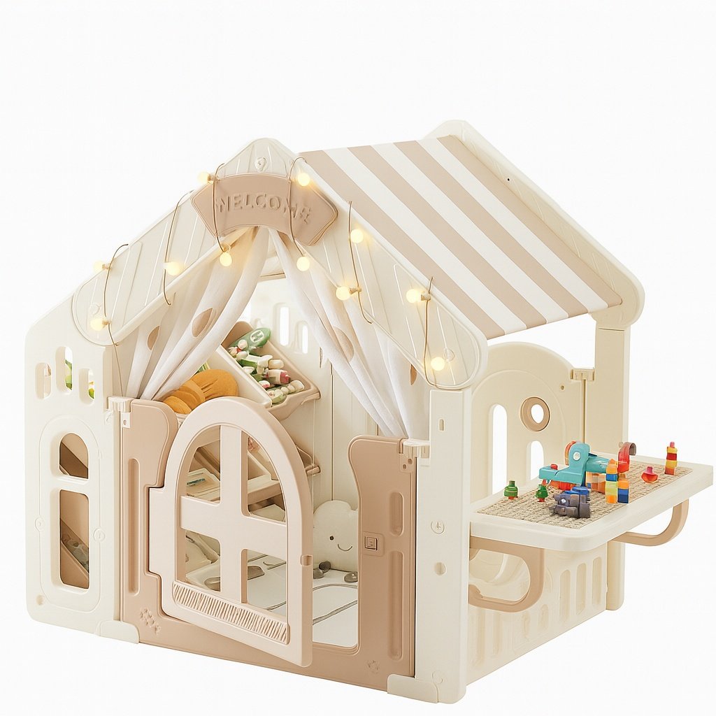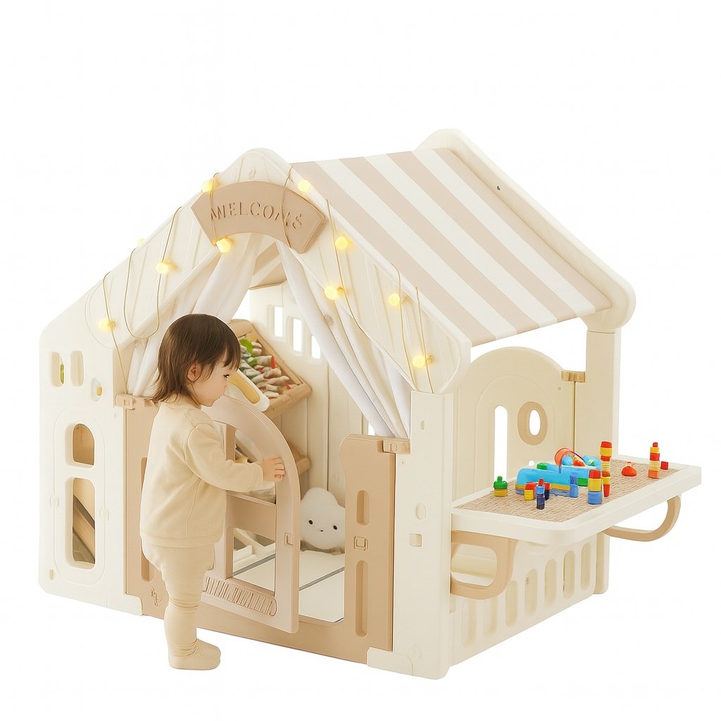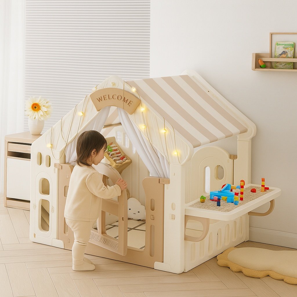 Create a magical play space for your child with this beautifully designed indoor playhouse. Featuring a charming Beige striped roof, cozy curtains, and warm fairy lights, this playhouse invites endless imaginative play. The attached activity table with a building block surface adds a creative touch, allowing your child to build, play, and explore in their own little world. Crafted from high-quality, child-safe materials, this playhouse blends perfectly with modern home décor while offering a safe and engaging play environment.