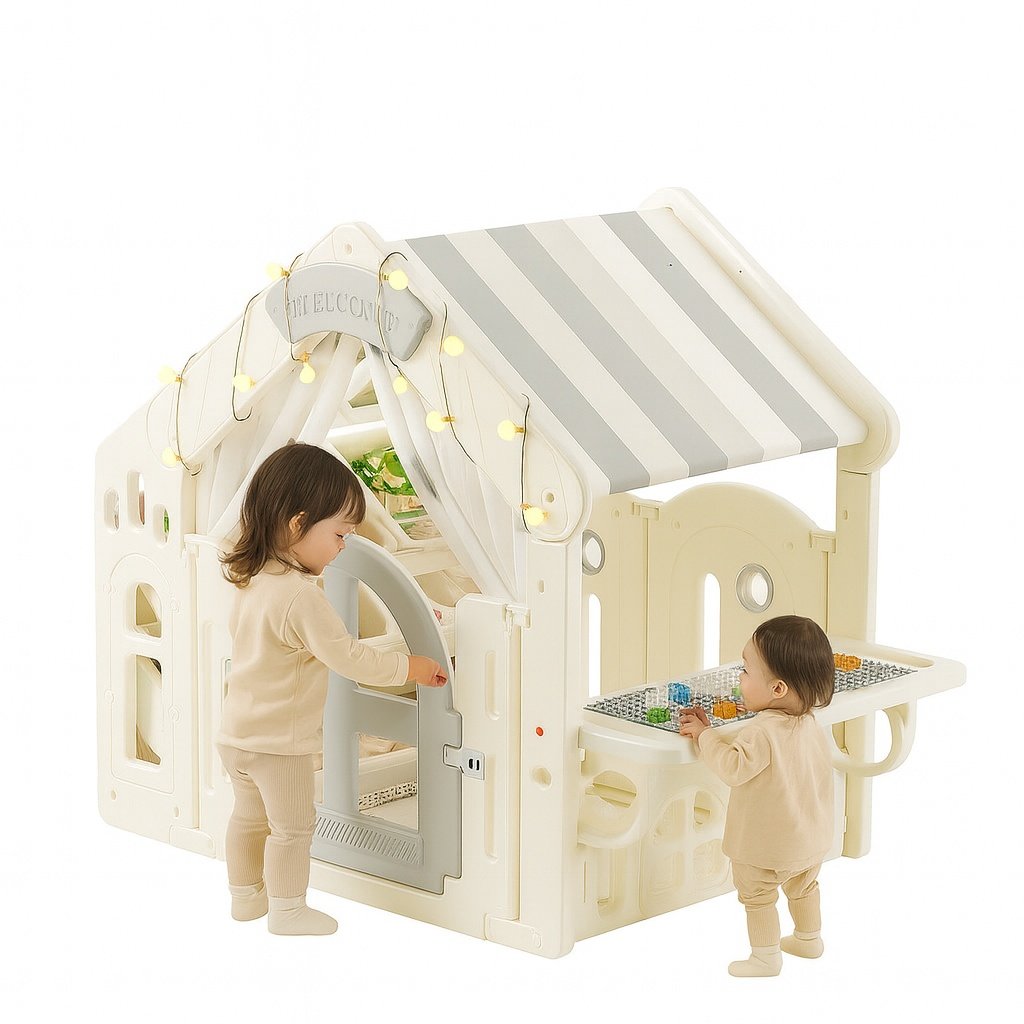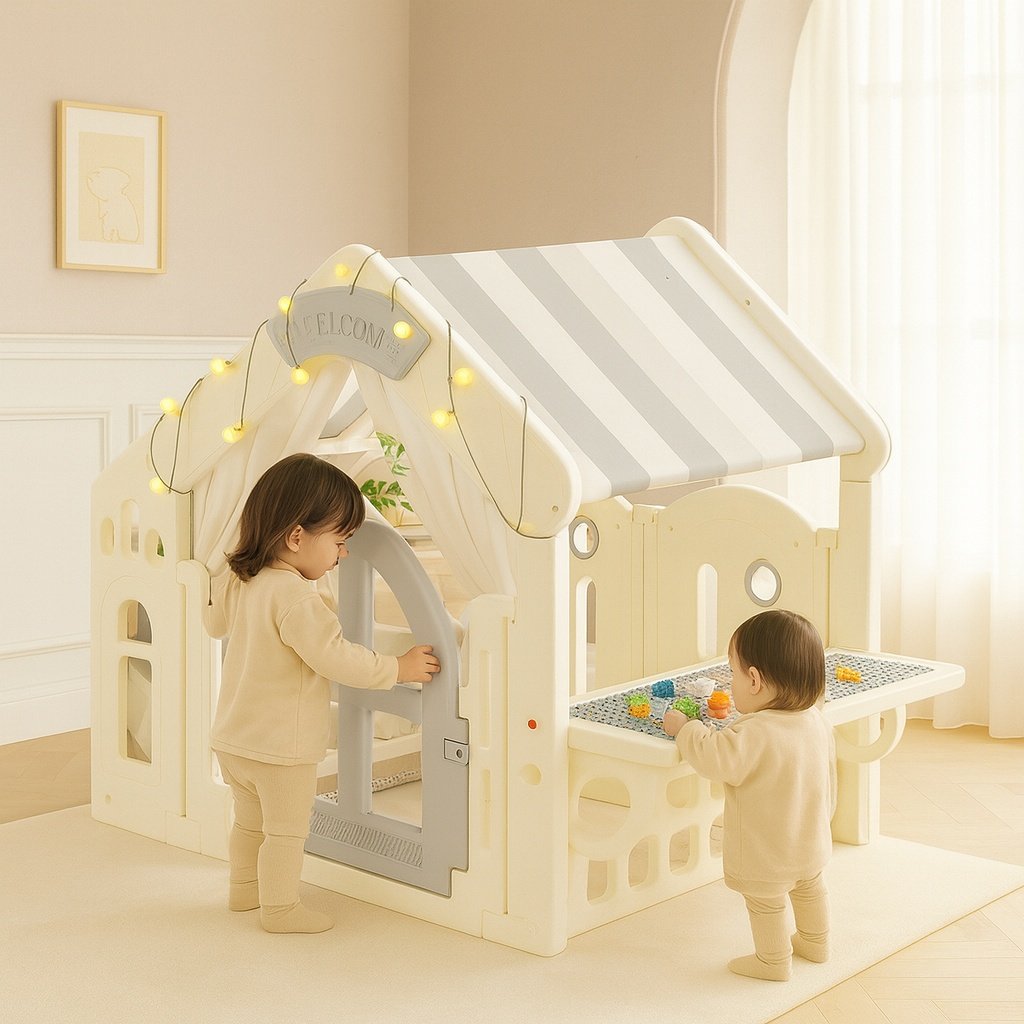 Create a magical play space for your child with this beautifully designed indoor playhouse. Featuring a charming grey striped roof, cozy curtains, and warm fairy lights, this playhouse invites endless imaginative play. The attached activity table with a building block surface adds a creative touch, allowing your child to build, play, and explore in their own little world. Crafted from high-quality, child-safe materials, this playhouse blends perfectly with modern home décor while offering a safe and engaging play environment.